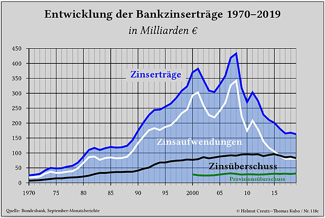 Helmut Creutz hat in einer seiner bekannten Grafiken über Jahre die Entwicklung der Bankzinserträge dokumentiert (Nr. 118a). Seine Grafik wurde hier ergänzt durch die Provisionsüberschüsse (Nr. 118c), hier in grün, und verlängert bis einschließlich 2019.