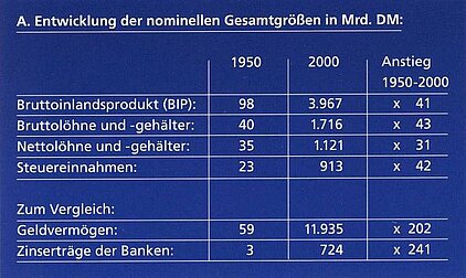 Gemessen an der Entwicklung des BIP nahmen diese Bruttoeinkommen nur um 74 Prozent zu, die Nettoeinkommen sogar nur um 57 Prozent. Dagegen sind die Geldvermögensbestände und mit ihnen die Zinserträge von 1950 bis 2000 fünf bzw. sechs Mal so rasch angestiegen wie das BIP und neun bzw. zehn Mal so rasch wie die Nettoeinkommen der Arbeitnehmer!